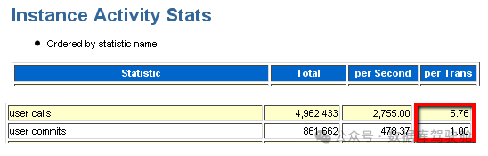「过度的应用程序提交」 在这种情况下需要回答的问题是“应用程序是否提交过于频繁?”如果是,频繁的提交活动会导致性能问题,因为提交会将重做从日志缓冲区刷新到重做日志,这会导致“log file sync”等待。要识别潜在的高提交率,如果“log file sync”的平均等待时间远高于“log file parallel write”的平均等待时间,这意味着大部分等待时间不是由于等待重做写入,因此慢 IO 不是问题的原因。多余的时间是 CPU 活动,通常是由于过度提交引起的争用。此外,如果“log file sync”的平均等待时间低,但等待次数多,则应用程序可能提交过于频繁。比较用户提交和用户回滚与用户调用的平均值:在 AWR 或 Statspack 报告中,如果“user calls/(user commits+user rollbacks)”的平均用户调用次数小于 30,则表示提交过于频繁: