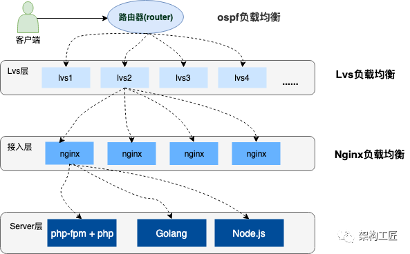 在大型分布式架构中,负责负载均衡的有很多种,而且是逐层进行压力均衡,从上图中可以看到ospf(开放式最短路径优先)负载均衡,LVS负载均衡,Nginx负载均衡,还有后面的服务层的软负载均衡算法等等。咱们这次不探讨Nginx的原理,我先从配置入手,主要重点在于如何能用正确的姿势来使用好我们的Nginx。