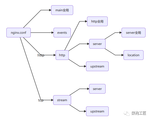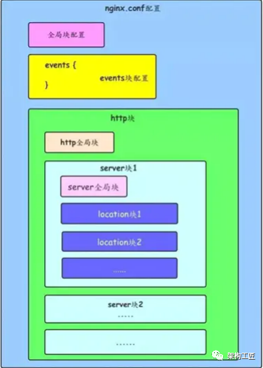 # main 全局配置....event {worker_connections 1024;multi_accept on;use epoll;}http { # http设置....server { # 服务器主机配置....location { # 路由配置....}}upstream name { # 负载均衡配置....}}