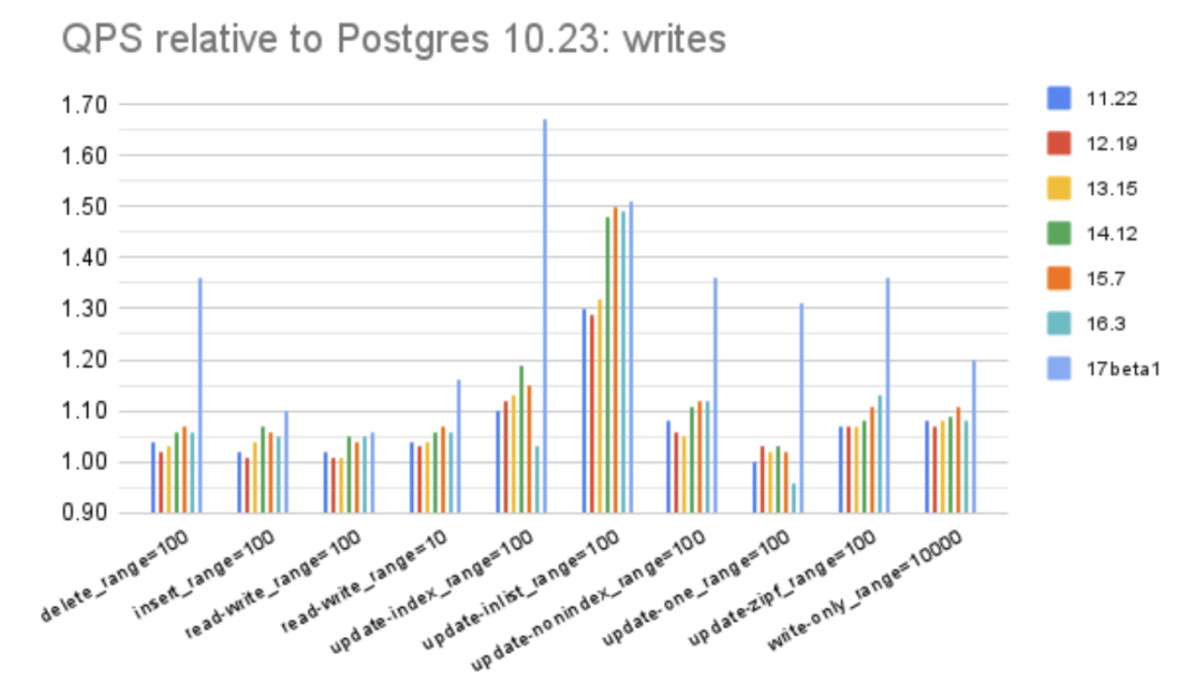 PostgreSQL 17 RC1 发布,有性能评测表明 PG17 写入性能(吞吐量)有非常显著(最高达50%+)的提升。