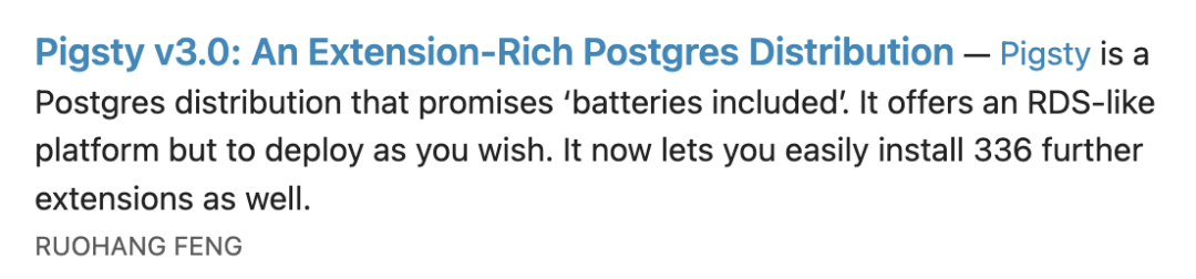 开箱即用的 PostgreSQL 发行版 —— Pigsty 发布了 v3.0.1 版本,提供了 336 个开箱即用的扩展插件与 6 种 PG 可替换内核。v3.0 提供了对 PostgreSQL 17 的支持 —— 包括全新的监控指标与面板。(当然,正式将 PG 17 作为默认大版本,需要等到 17 完全成熟以后)