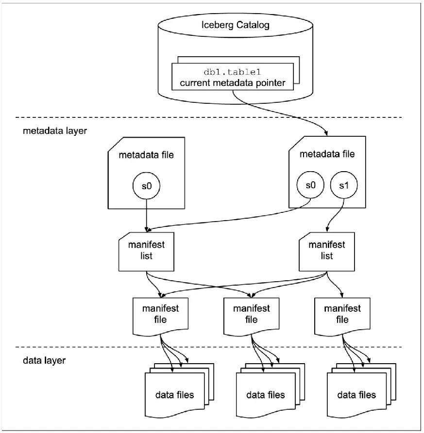 元数据文件(Metadata File):存储当前版本的元数据,包括所有快照信息。 快照(Snapshot):代表特定操作的快照,每次提交都会生成一个新快照,其中包含多个清单,详细说明生成的数据文件的地址。 清单(Manifest):列出与快照关联的数据文件,提供数据组织的全面视图,并促进高效的数据检索和修改。