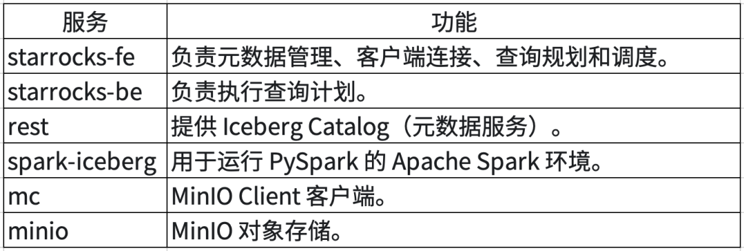 详细教程请见文档:https://docs.starrocks.io/zh/docs/quick_start/iceberg/ Iceberg Quick Start 请参考 Iceberg 文档:https://iceberg.apache.org/spark-quickstart/