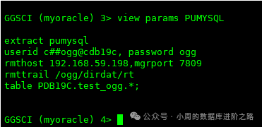 GGSCI (myoracle) 6> info PUMYSQL detail #查看更详细的信息。包括所使用的trail文件,参数文件、