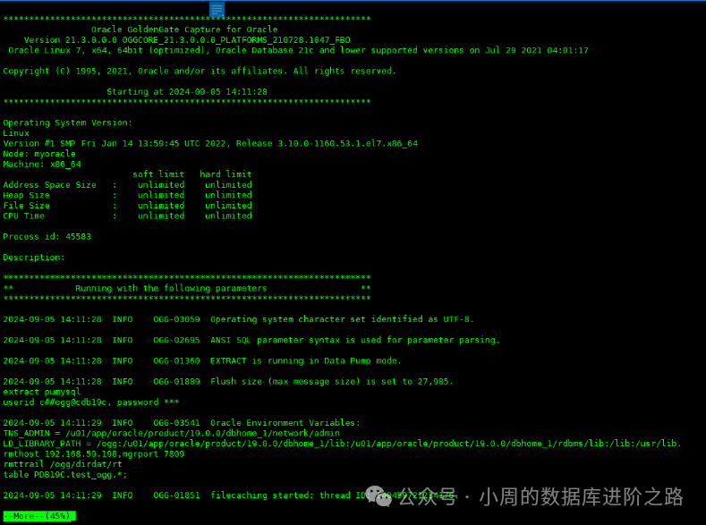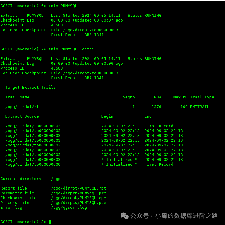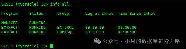 GGSCI (myoracle) 6> info PUMYSQL # 查看到的信息包括进程状态、checkpoint信息、延时等