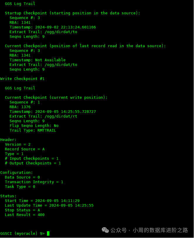 GGSCI (myoracle) 6> info PUMYSQL showch #查看到详细的关于checkpoint的信息,用于查看