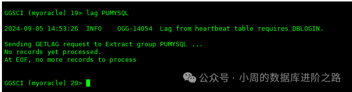 GGSCI (myoracle) 9> lag PUMYSQL # 此命令比用info命令查看到的延时信息更加精确。