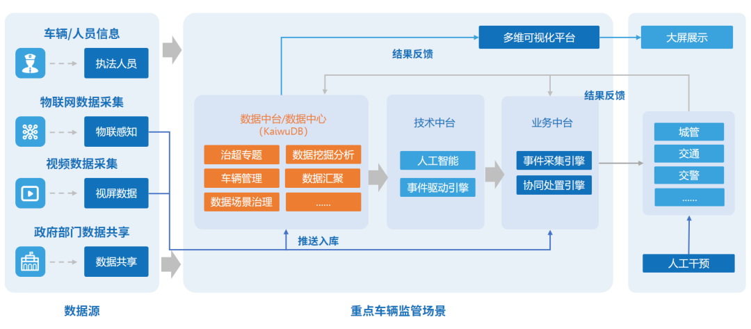 方案以 “Powered by KaiwuDB” 的城市大脑提供的智慧城市基础设施和数据汇聚为基座,运用大数据、AI 等多种新技术,建立城市重点车辆监管平台,实现城市重点车辆的全流程、多维度、精准化、智能化的监管,提高城市重点车辆的交通安全监管水平。