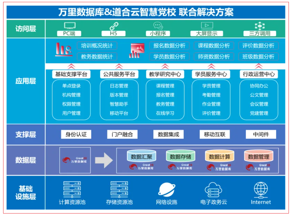 信创数据库是双方达成合作的重要基础。在国家大力推动信创产业发展背景下,万里数据库作为国内首批通过安全可靠测评的数据库厂商之一,拥有自主可控核心技术,具备卓越的信创数据库能力,与道合云致力于党校信息化建设的国产化需求不谋而合。