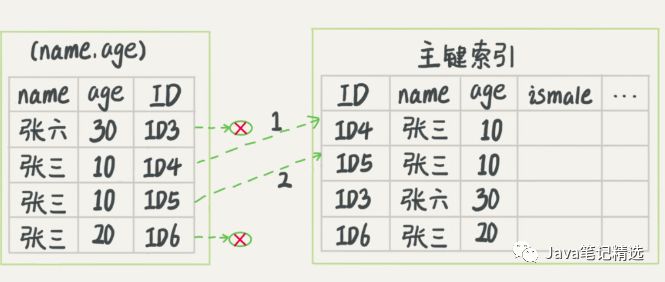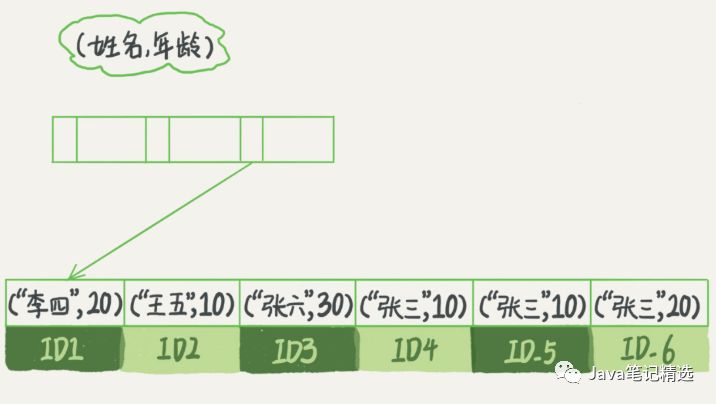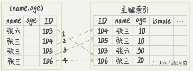 当查到所有名字是张三的人时,可以快速定位到ID4,饭后向后遍历得到所有需要的结果。