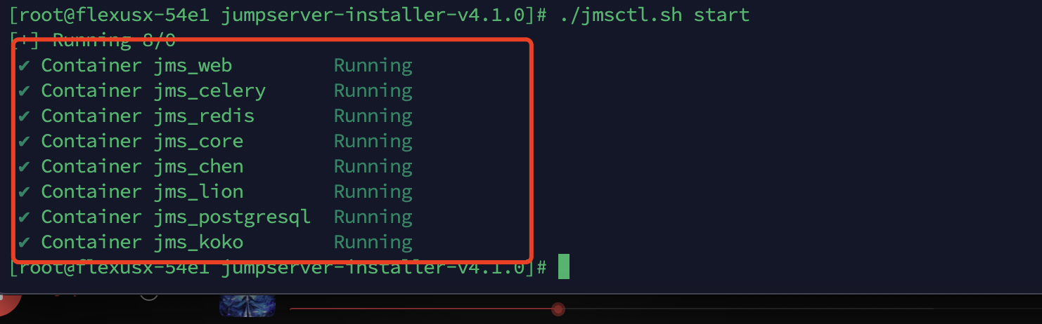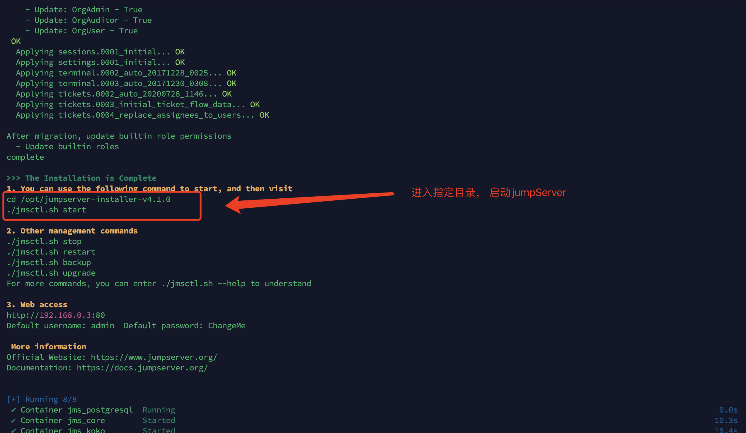 cd /opt/jumpserver-installer-v4.1.0 注意这个地址需要根据安装完成之后的提示来动态改变