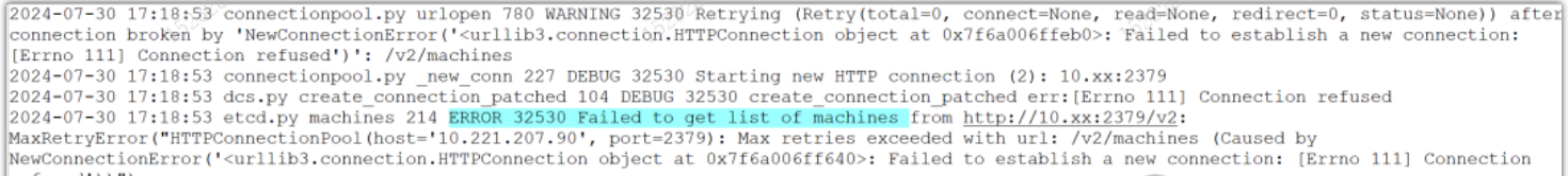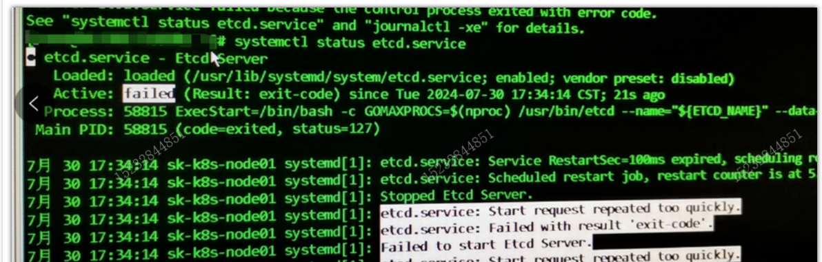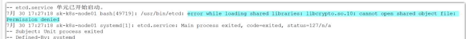 通过以上log判断为etcd服务异常,手动启动etcd报错: