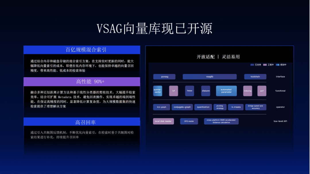 社区还新发布向量索引库VSAG。VSAG是蚂蚁集团在向量数据库上一系列的工程优化与向量索引的算法改进成果,适用于高维向量的存储和计算优化,并能提供 C++ 和 Python 的接口以便使用。VSAG已在蚂蚁内部百亿数据量级业务上使用,在保证同样的召回率情况下,VSAG 可以通过量化和基于磁盘的重排技术,将内存消耗降低到 HNSW(最流行的向量索引)的 1/10,从而实现生产部署成本的大幅降低。VSAG将结合DB-GPT,让RAG的构建更加简单、高效,同时VSAG作为独立开放的向量引擎,也将支持LangChain、LlamaIndex构建RAG应用。