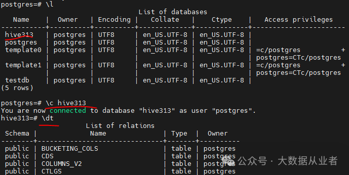 psql -h felixzh -d postgres -U postgres -p 5432postgres=# create database hive313;CREATE DATABASE