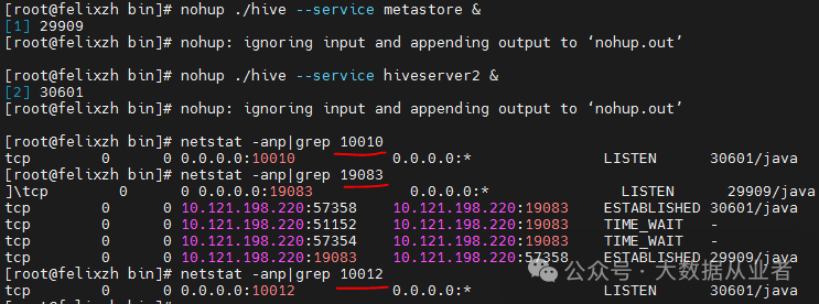 nohup ./hive --service metastore &nohup ./hive --service hiveserver2 &