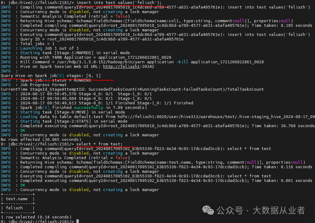 set hive.execution.engine=spark;create table test(name string);insert into test values('felixzh');select * from test;