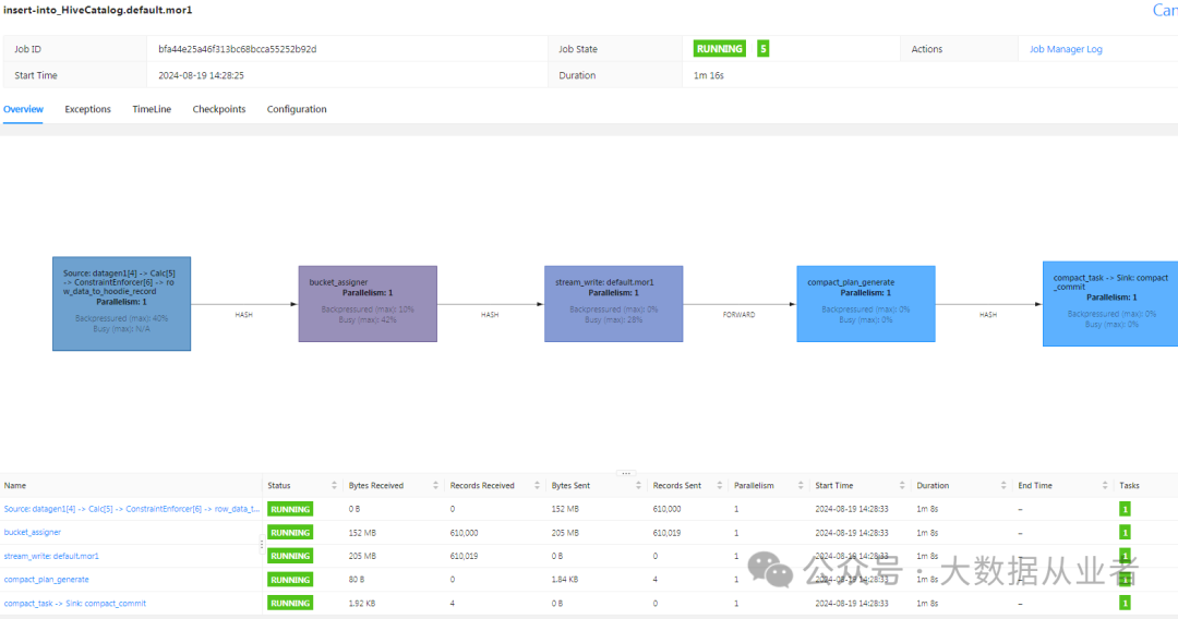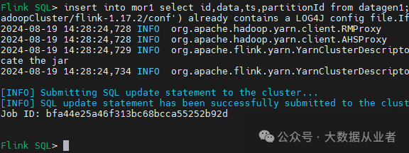 insert into mor1 select id,data,ts,partitionId from datagen1;