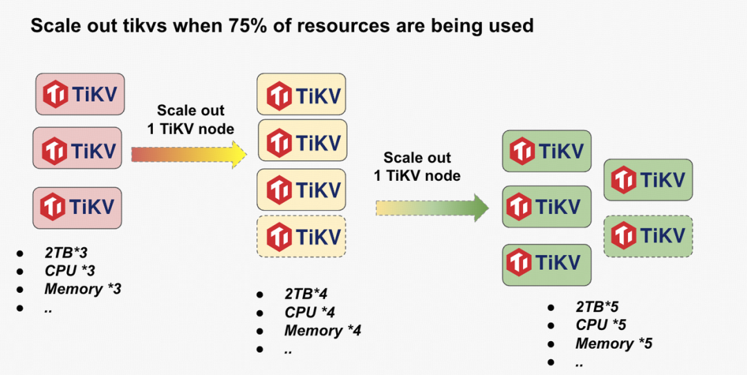 一般的,当集群中 TiKV 资源跑到 75% 左右时,一般的调优手段无法解决资源使用上的瓶颈,此时,我们就需要通过 添加 tikv 节点的方式,来提高集群的整体性能。
