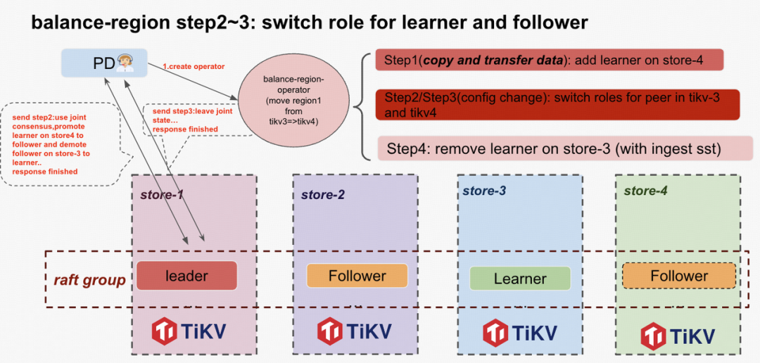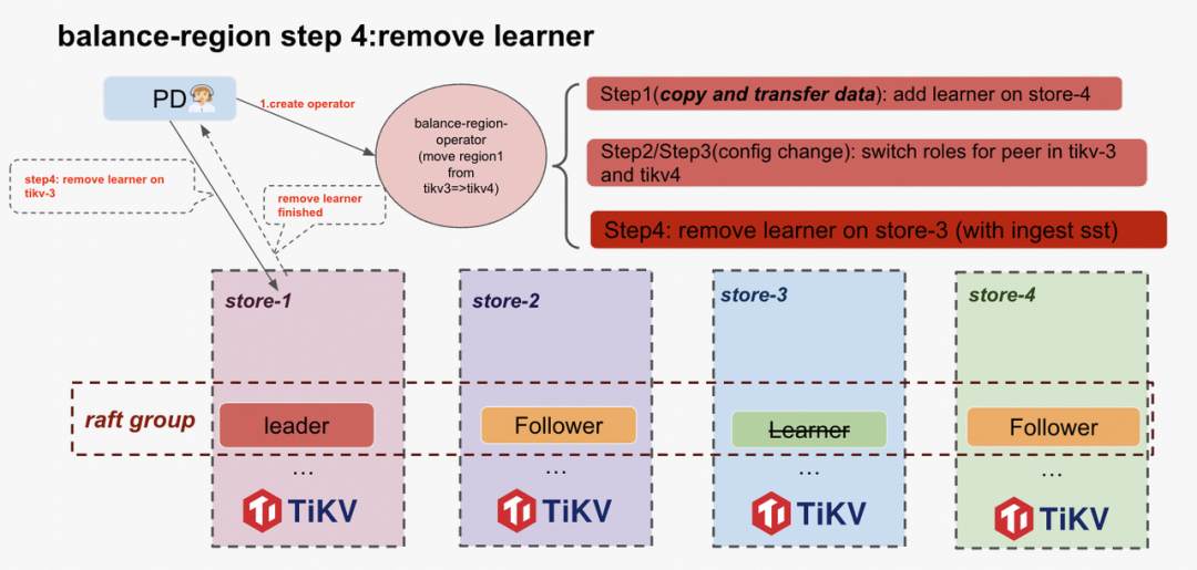 store-4 上的 learner 节点虽然有完整的数据,但不参与投票过程。我们期望是将 store-3 上的 follower 迁移到 store-4 上,因此,在这一步骤,我们会将 store-4 和 store-3 上的副本的角色互换,最终 store-3 上的老副本会变成 learner, 而新节点上的副本角色变成 voter 也就是 follower.这个过程为了保证数据的安全性,实际情况分为两条调度指令执行。