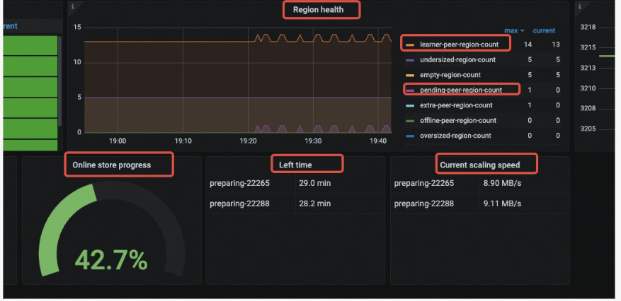 在扩容后,要做到整个集群的资源的快速均匀,一般跟我们 region 的数量、size 有直接关系,当然与我们集群的繁忙程度也有关系。目前,PD 提供了一些监控可以让我们看到扩容的状态,主要有