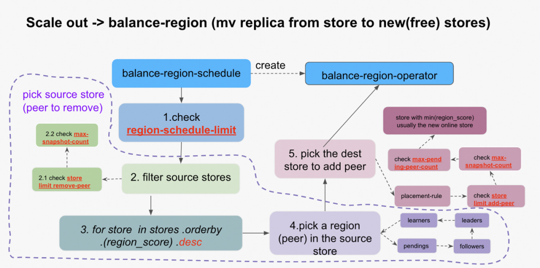 ensure balance-region-scheduler is running region-schedule-limit ( https://docs.pingcap.com/tidb/v7.5/pd-configuration-file#region-schedule-limit ) :control the generation speed of schedule-region operator store limit remove-peer/add-peer ( https://docs.pingcap.com/tidb/stable/configure-store-limit#principles-of-store-limit-v2 ) : speed limit for the special store max-snapshot-count ( https://docs.pingcap.com/tidb/stable/pd-configuration-file#max-snapshot-count ) : when the number of snapshots that a single store receives or sends meet the limit, it will never be choosed as a source or target store max-pending-peer-count ( https://docs.pingcap.com/tidb/stable/pd-configuration-file#max-pending-peer-count ): control the maximum number of pending peers in a single store.