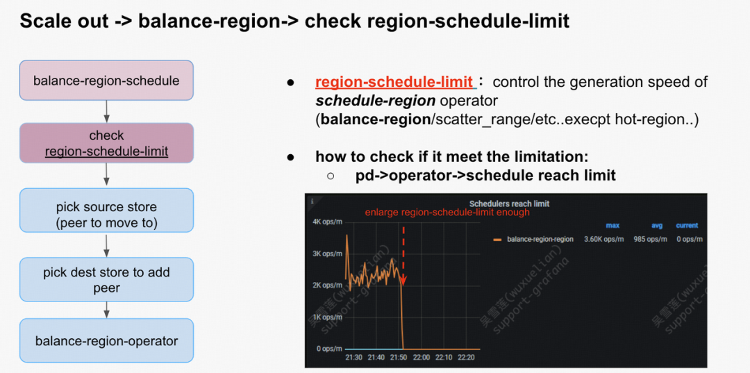 region-schedule-limit 是用来控制 balance-region scatter-range/hot-region 等 region 相关的 operator 生成的并发度的,默认值是 2048,一般很难到达瓶颈。但考虑到这个参数是可以修改的,有时候误操作会将这个参数改得比较小,就容易出现问题。