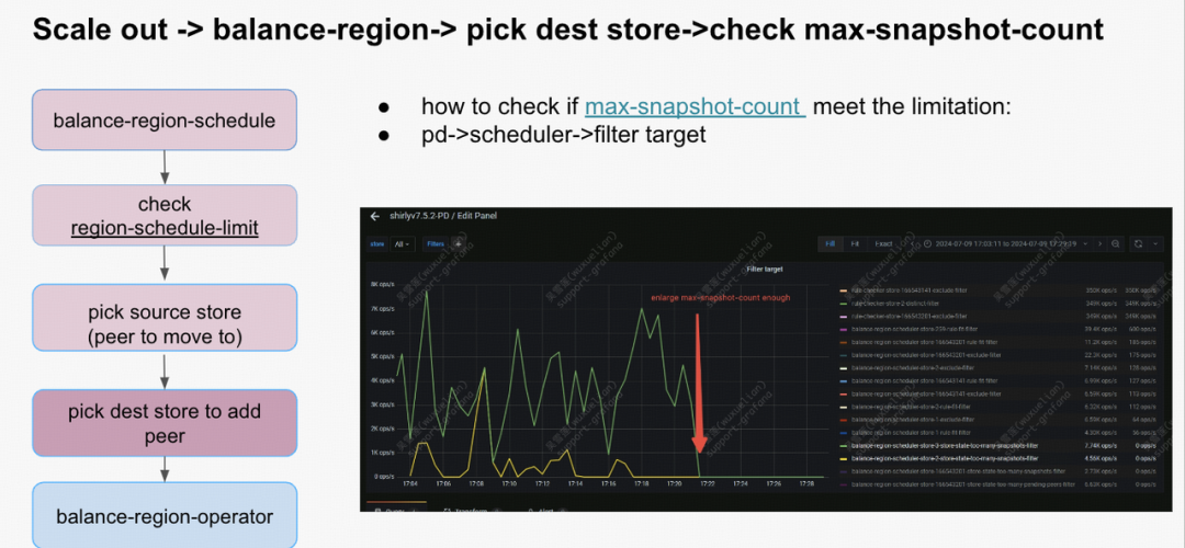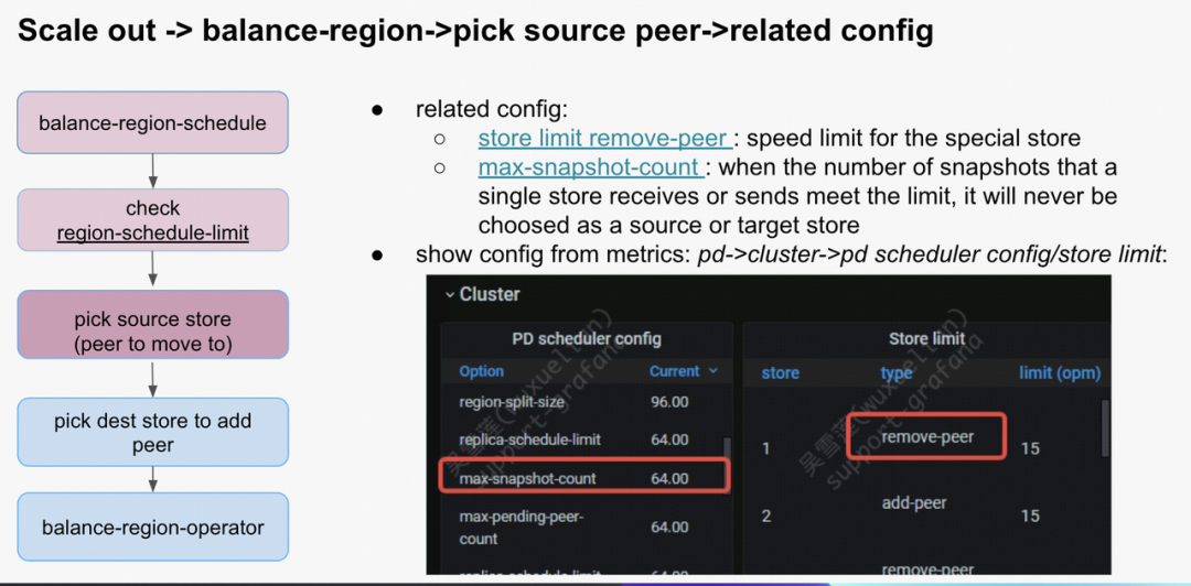 store limit add-peer ( https://docs.pingcap.com/tidb/stable/configure-store-limit#principles-of-store-limit-v2 ) : speed limit for the special store max-snapshot-count ( https://docs.pingcap.com/tidb/stable/pd-configuration-file#max-snapshot-count ) : when the number of snapshots that a single store receives or sends meet the limit, it will never be chosen as a source or target store max-pending-peer-count ( https://docs.pingcap.com/tidb/stable/pd-configuration-file#max-pending-peer-count ): control the maximum number of pending peers in a single store. Metrics 中查看配置项(同 source store 配置项查看):pd->cluster->pd scheduler config/store limit 查看目标节点配置项是否遇到瓶颈:pd->schedule -> filter target -> balance-regionXXX-{config}-filter