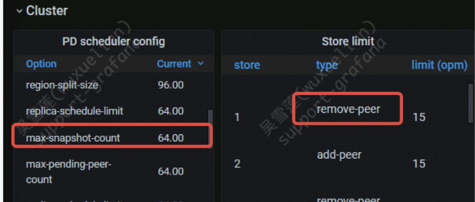 通过监控查看 store limit 配置:PD->cluster->PD scheduler config/store limit