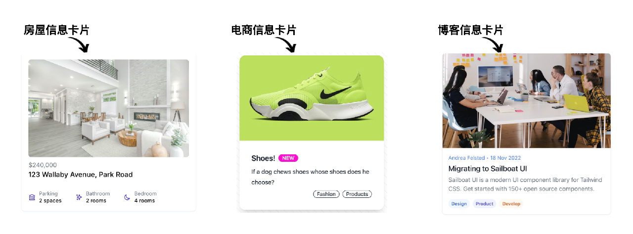 举一个简单的例子,如下图所示,分别构建一个房屋信息卡片、电商信息卡片、博客信息卡片。三者构建的内容模型字段各有不同。