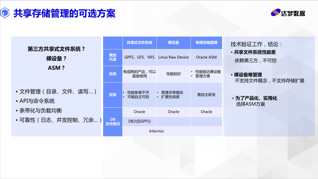 共享存储的方案,在过去一段时间有些沉寂,分布式架构占据了更多眼球;但其实从场景来看,共享存储架构会有更大的空间,能在一定程度上解决单机架构的不足,且没有分布式架构所带来的复杂性。比较欣喜的是,本次大会上看到多家国内厂商经过多年积累,在共享存储架构上逐步成熟完善并开始在生产环境投产。如达梦黄老师就在大会的第一场带来了共享存储架构的分享。