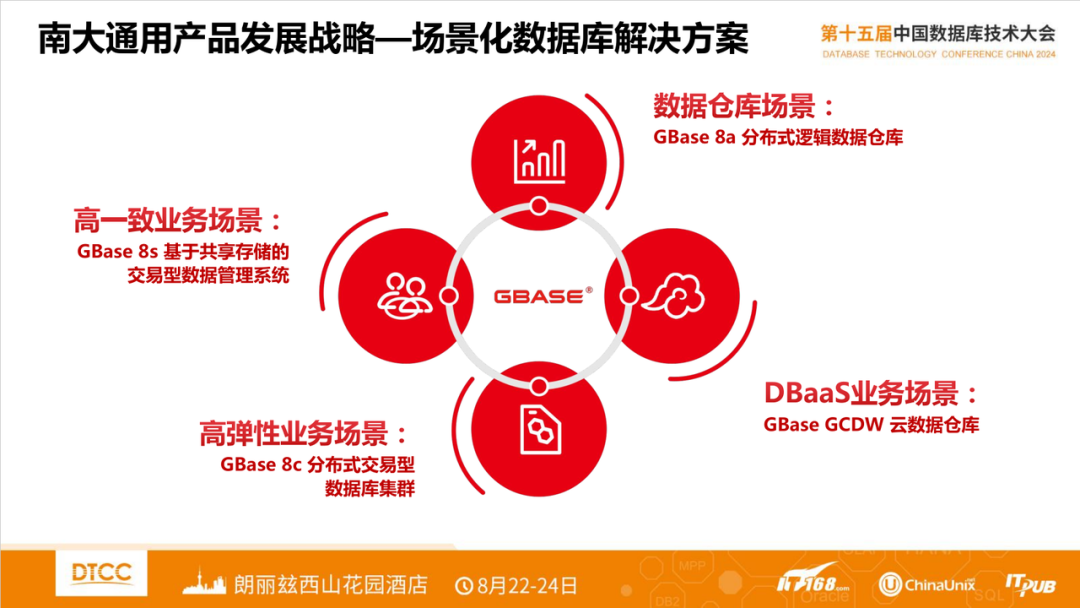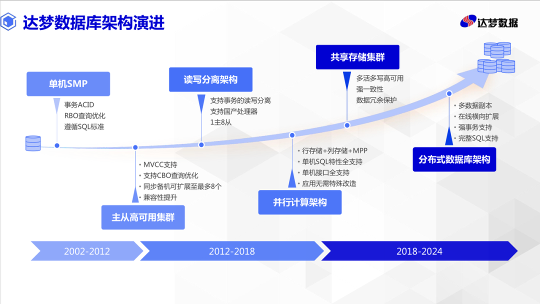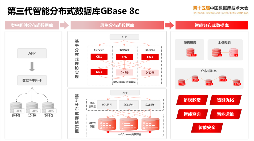 分布式架构经过多年发展,细分为多种类型,包括基于中间件形态、原生分布式和基于分布式存储。此次大会上南大通用提出一种智能分布式的概念,其实这与下文谈到的一体化概念趋同,就是在单一内核上支持多种产品形态,覆盖单机、主备、分布式等,其来源最早是 OceanBase 提出的单机分布式一体化。这样有利于用户充分享受不同架构带来受益的同时,可以兼顾未来发展。