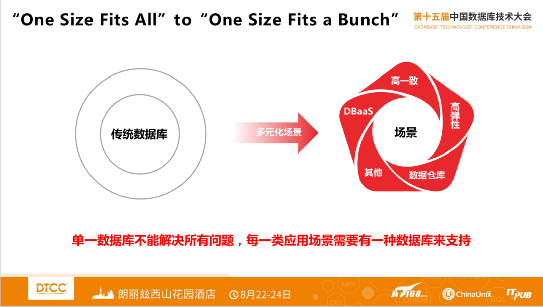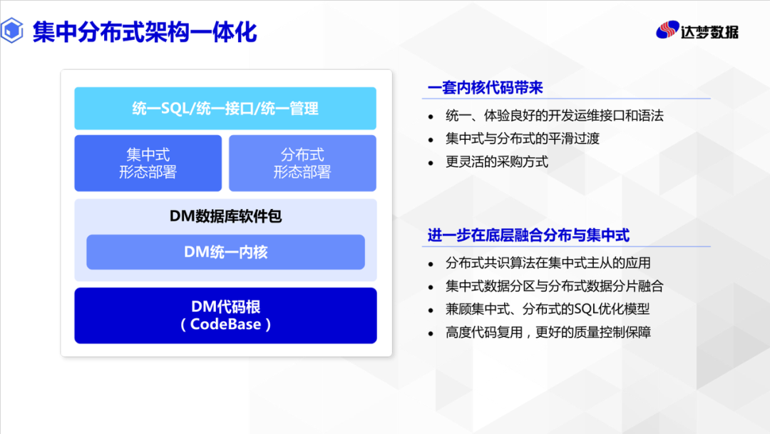 如上文所讲,一体化的概念在本次大会上被多次提及。这里所说的一体化,包含了多种解读方式。例如达梦会上提出的架构一体化,通过一套内核代码,提供多种部署形态,高度代码复用,也便于更好的质量控制。