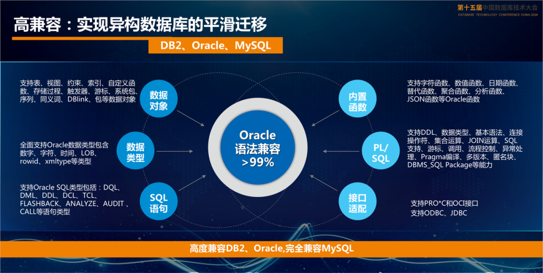 兼容性是各家厂商都在不断补齐的方向,这其中就包括了对象、语法、数据类型等。如下图就是来自金纂信科 GoldenDB 在兼容性方面的情况。