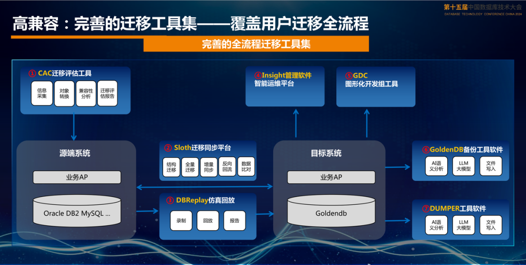 完美的兼容性是不可能的,要想顺利地替换原数据库还需要完善配套的工具来辅助。如下图就展示了从迁移评估、结构迁移、数据迁移、增量同步、数据比对、流量切换、仿真回切等多个步骤及配套的运维、开发、备份等工具。
