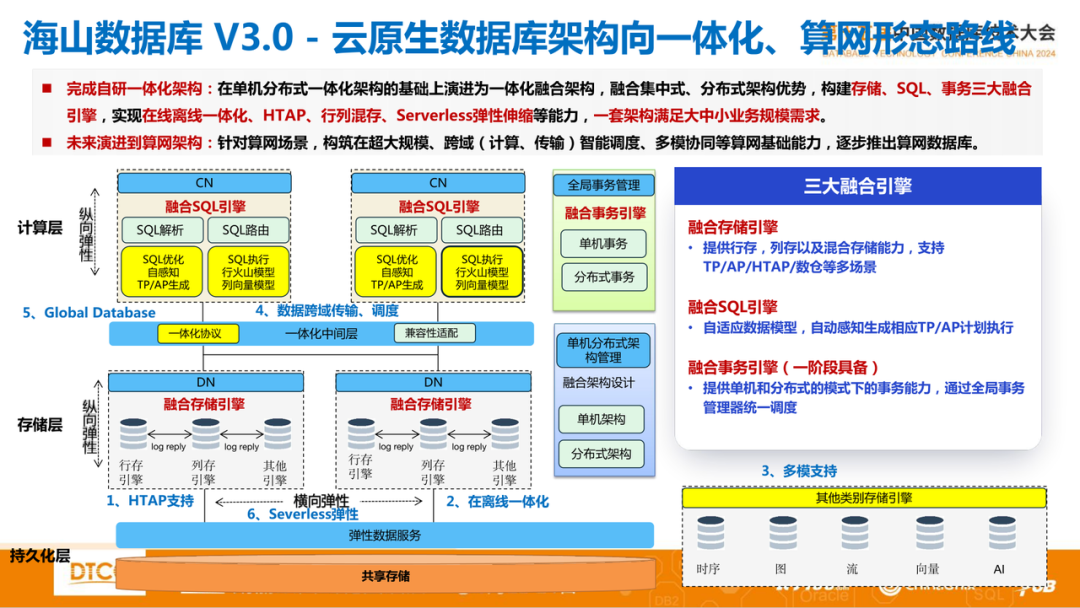 其产品海山数据库,正处于第三阶段向第四阶段发展之中,并提出了一体化融合架构,包括有架构融合、引擎融合、场景融合,一套架构适用不同规模业务用户。