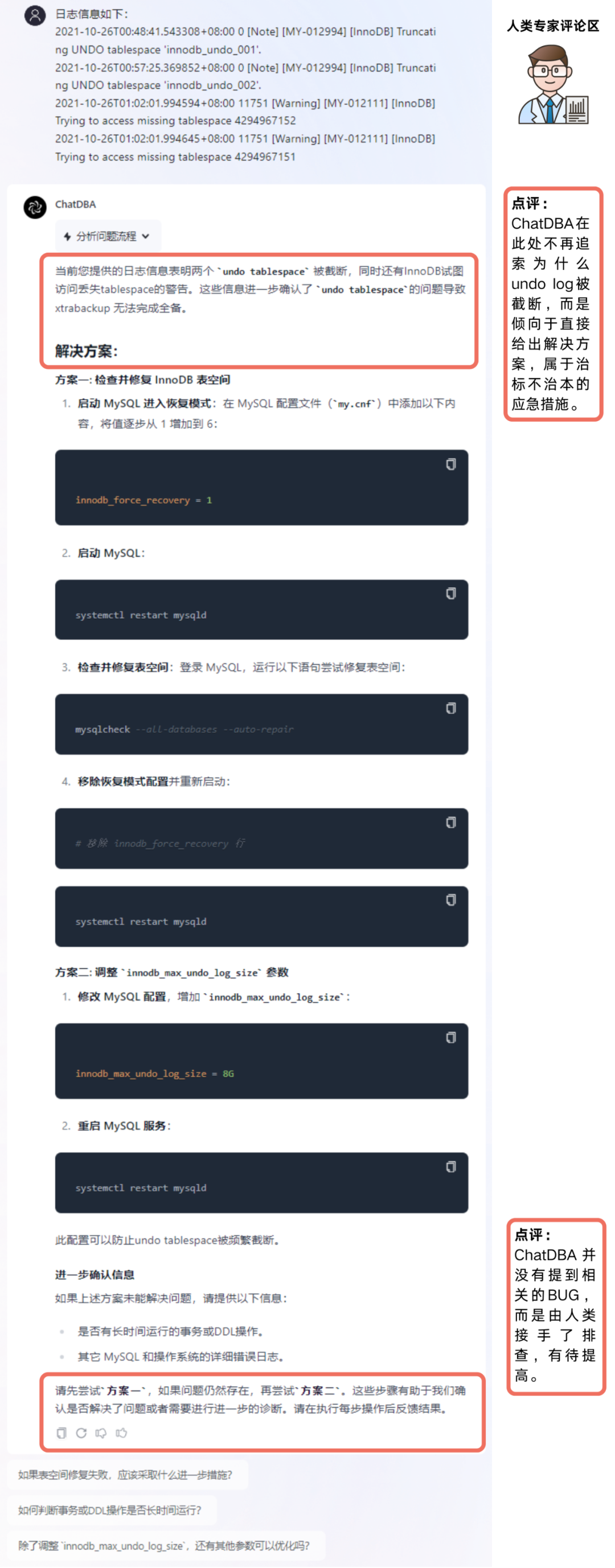 然后我们给到 ChatDBA 对应的错误日志,ChatDBA 根据错误日志首先确认是由于 InnoDB 尝试访问丢失的 tablespace 导致的问题,同时给到了对应的解决方案。