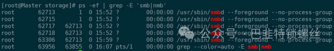 [root@Master storage]# systemctl status smb nmb● smb.service - Samba SMB DaemonLoaded: loaded (/usr/lib/systemd/system/smb.service; disabled; vendor preset: disabled)Active: active (running) since Fri 2024-01-05 15:52:35 CST; 14min agoDocs: man:smbd(8)man:samba(7)man:smb.conf(5)Main PID: 62713 (smbd)Status: "smbd: ready to serve connections..."Tasks: 4 (limit: 12150)Memory: 5.9MCGroup: /system.slice/smb.service├─62713 /usr/sbin/smbd --foreground --no-process-group├─62717 /usr/sbin/smbd --foreground --no-process-group├─62718 /usr/sbin/smbd --foreground --no-process-group└─63306 /usr/sbin/smbd --foreground --no-process-group1月 05 15:52:35 Master systemd[1]: Starting Samba SMB Daemon...1月 05 15:52:35 Master smbd[62713]: [2024/01/05 15:52:35.037273, 0] ../../source3/smbd/server.c:1741(main)1月 05 15:52:35 Master smbd[62713]: smbd version 4.17.5 started.1月 05 15:52:35 Master smbd[62713]: Copyright Andrew Tridgell and the Samba Team 1992-20221月 05 15:52:35 Master systemd[1]: Started Samba SMB Daemon.● nmb.service - Samba NMB DaemonLoaded: loaded (/usr/lib/systemd/system/nmb.service; disabled; vendor preset: disabled)Active: active (running) since Fri 2024-01-05 15:52:35 CST; 14min agoDocs: man:nmbd(8)man:samba(7)man:smb.conf(5)[root@Master storage]# ps -ef | grep -E 'smb|nmb'root 62713 1 0 15:52 ? 00:00:00 usr/sbin/smbd --foreground --no-process-grouproot 62715 1 0 15:52 ? 00:00:00 usr/sbin/nmbd --foreground --no-process-grouproot 62717 62713 0 15:52 ? 00:00:00 usr/sbin/smbd --foreground --no-process-grouproot 62718 62713 0 15:52 ? 00:00:00 usr/sbin/smbd --foreground --no-process-grouproot 63306 62713 0 15:59 ? 00:00:00 usr/sbin/smbd --foreground --no-process-grouproot 63956 63855 0 16:07 pts/1 00:00:00 grep --color=auto -E smb|nmb[root@Master storage]# netstat -tunlp | grep -E 'smbd|nmbd'tcp 0 0 0.0.0.0:445 0.0.0.0:* LISTEN 62713/smbdtcp 0 0 0.0.0.0:139 0.0.0.0:* LISTEN 62713/smbdtcp6 0 0 :::445 :::* LISTEN 62713/smbdtcp6 0 0 :::139 :::* LISTEN 62713/smbdudp 0 0 172.17.255.255:137 0.0.0.0:* 62715/nmbdudp 0 0 172.17.0.1:137 0.0.0.0:* 62715/nmbdudp 0 0 172.18.255.255:137 0.0.0.0:* 62715/nmbdudp 0 0 172.18.0.1:137 0.0.0.0:* 62715/nmbdudp 0 0 192.168.1.255:137 0.0.0.0:* 62715/nmbdudp 0 0 192.168.1.132:137 0.0.0.0:* 62715/nmbdudp 0 0 0.0.0.0:137 0.0.0.0:* 62715/nmbdudp 0 0 172.17.255.255:138 0.0.0.0:* 62715/nmbdudp 0 0 172.17.0.1:138 0.0.0.0:* 62715/nmbdudp 0 0 172.18.255.255:138 0.0.0.0:* 62715/nmbdudp 0 0 172.18.0.1:138 0.0.0.0:* 62715/nmbdudp 0 0 192.168.1.255:138 0.0.0.0:* 62715/nmbdudp 0 0 192.168.1.132:138 0.0.0.0:* 62715/nmbdudp 0 0 0.0.0.0:138 0.0.0.0:* 62715/nmbd