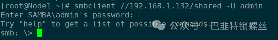 smbclient //192.168.1.132/shared -U admin然后输入密码进入-U 指定用户名/shared 共享模块