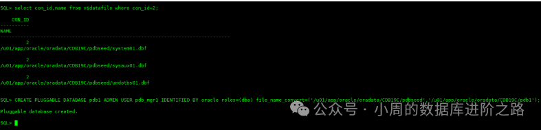 SQL> CREATE PLUGGABLE DATABASE pdb1 ADMIN USER pdb_mgr1 IDENTIFIED BY oracle roles=(dba) file_name_convert=('/u01/app/oracle/oradata/CDB19C/pdbseed','/u01/app/oracle/oradata/CDB19C/pdb1');