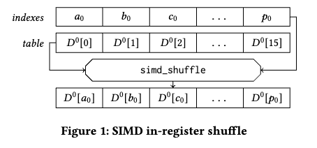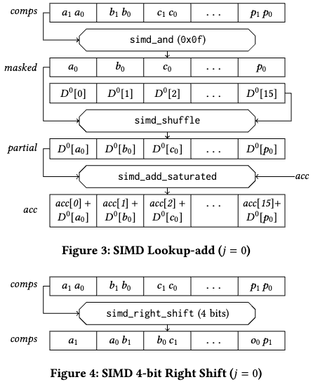 读码字:每次读取一个block的一行128bit,mask掉每个字节的高4位; 查距离:在SIMD寄存器中读取查找表,执行 pshufb
