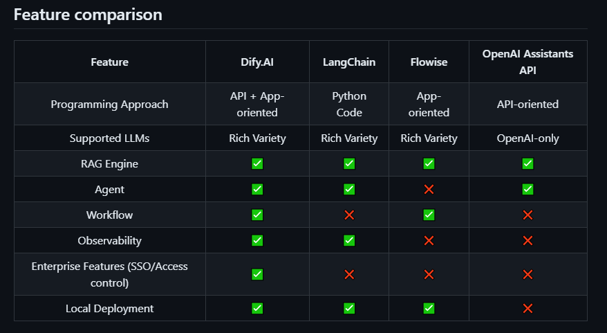 下图对 Dify 与其他流行平台(如 LangChain、Flowise 和 OpenAI Assistants API)进行了比较: