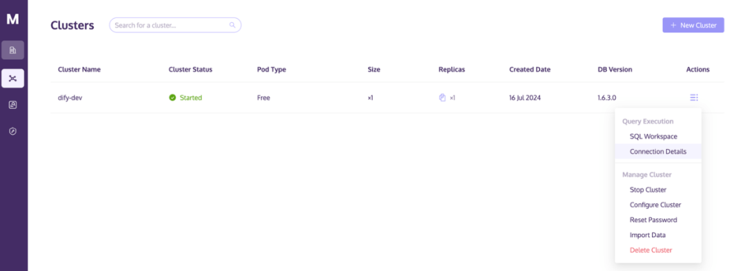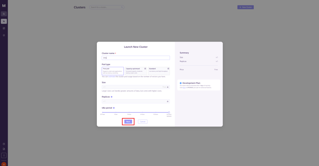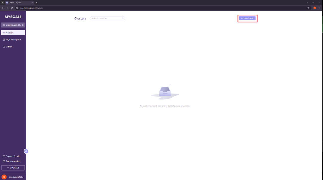 要开始使用 MyScale Cloud,请访问 MyScale 注册页面并创建一个新账户。设置好账户后,转到“集群”页面,点击右上角的“+ 新建集群”按钮创建一个新集群。