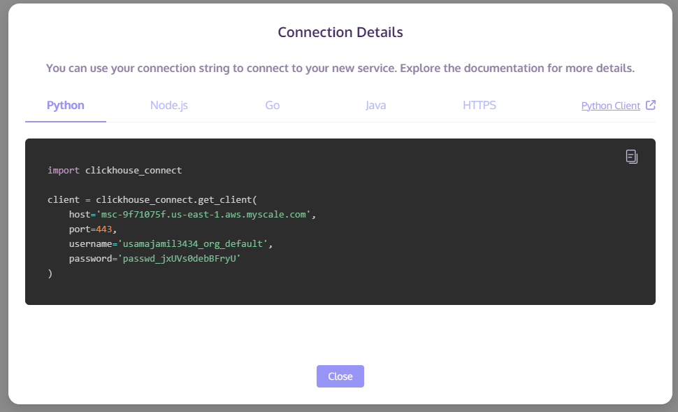 记录“Python”选项卡中的 host/port/username/password 信息。这些信息将用于配置 Dify 对 MyScale 集群的访问。