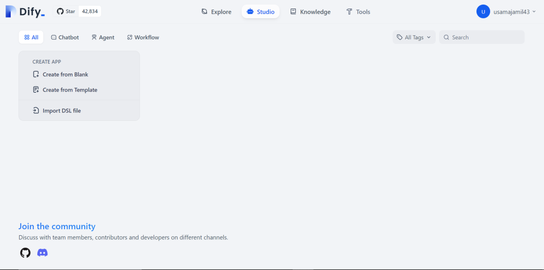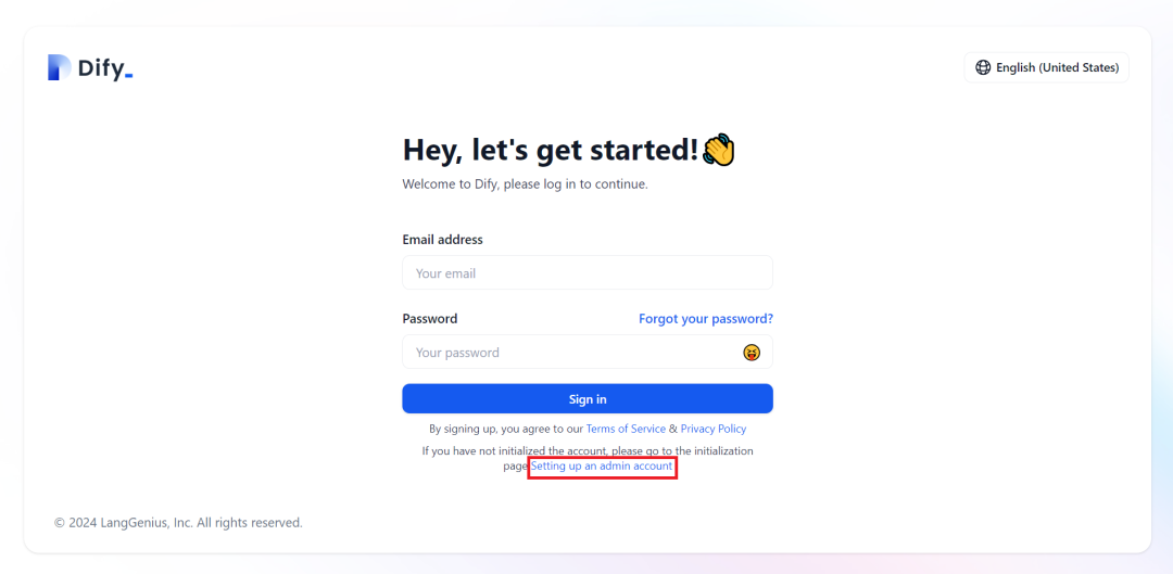 接下来,你需要设置一个管理员账户并登录 Dify。登录后,你将被定向到主页。