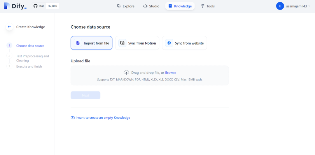 现在一切就绪,我们可以开始构建聊天机器人了。首先,我们需要一个知识库,供聊天机器人用来回答用户查询。点击“Knowledge”按钮,上传你想用作知识库的文件。