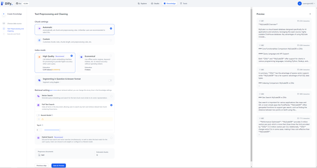 点击“保存并处理”按钮,系统将需要几秒钟时间来生成 embedding 并将数据存储在你的知识库(MyScale)中。数据保存完成后,知识库就设置好了。