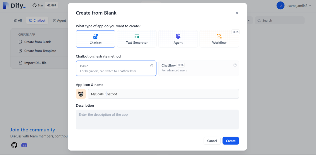 在 Studio 中,选择“Chatbot”,然后在“Create APP”菜单下点击“Create from Blank”。此时将弹出一个窗口,引导你完成后续步骤。