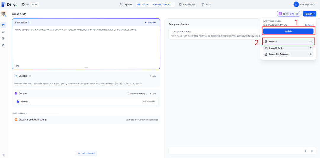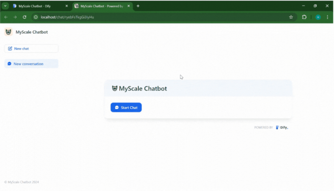 至此,我们的 Dify 平台和 MyScale 已顺利运行。现在我们可以开始构建聊天机器人了。