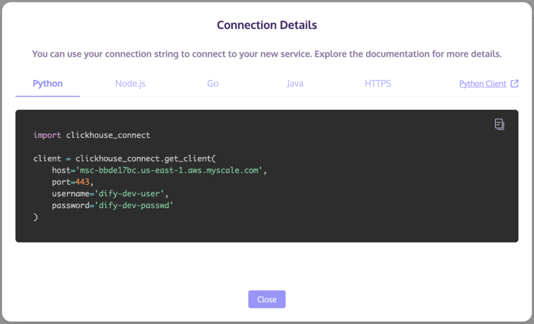 把鼠标移至 Cluster 右侧的 Actions 按钮,点击弹出列表中的 Connection Details,记录 Python 标签页中的 host/port/username/password 信息,用于后续配置 Dify 对 MyScale Cluster 的访问。