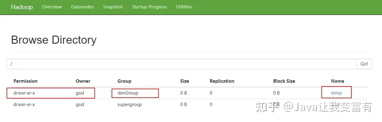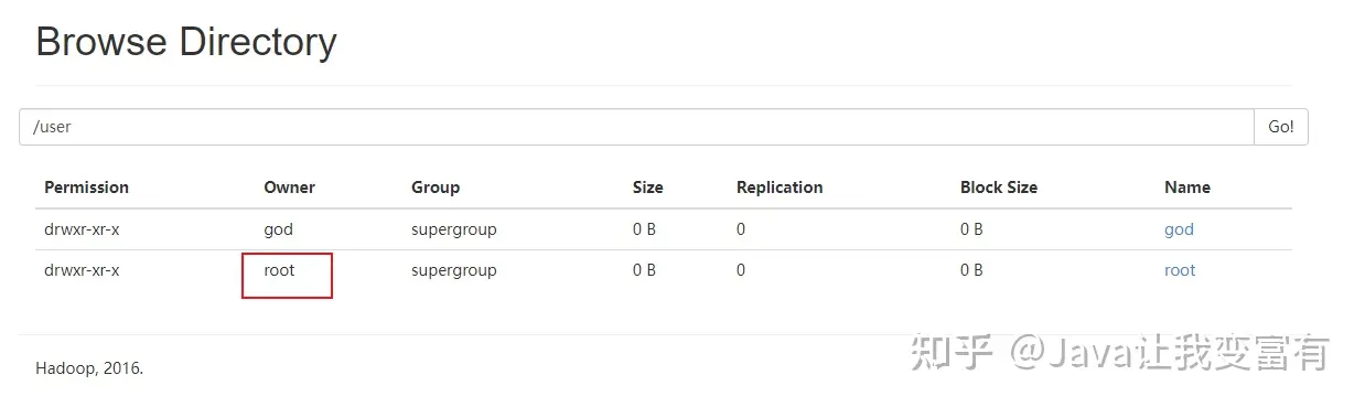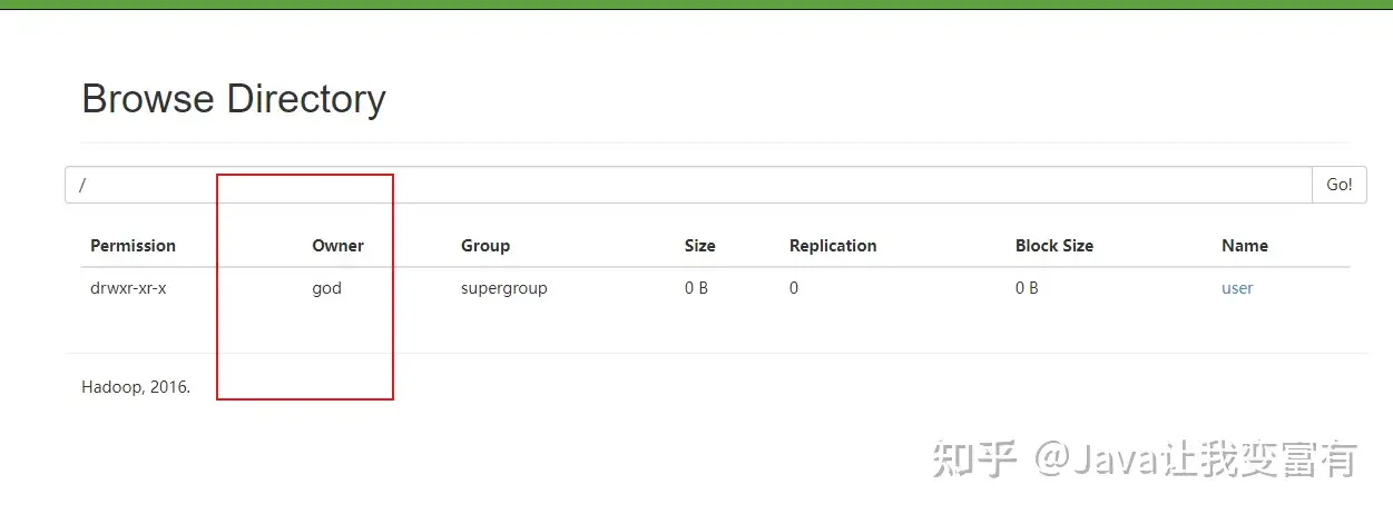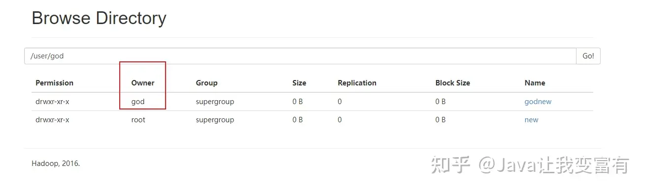 接下来我们用god用户创建目录,会发现在HDFS文件系统中,该目录的拥有者为god。